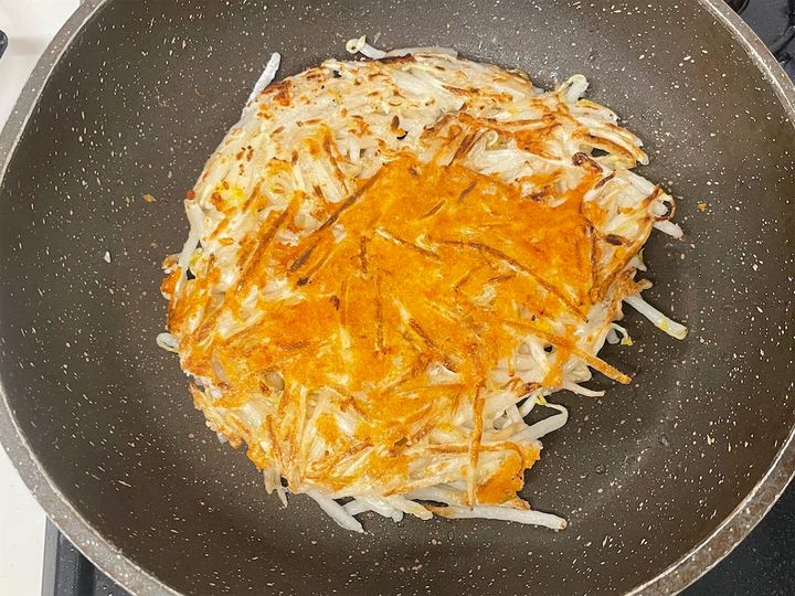 6. 中火で熱したフライパンに多めに油を引いて5を入れ、焼き色がつくまで2~3分焼きます。