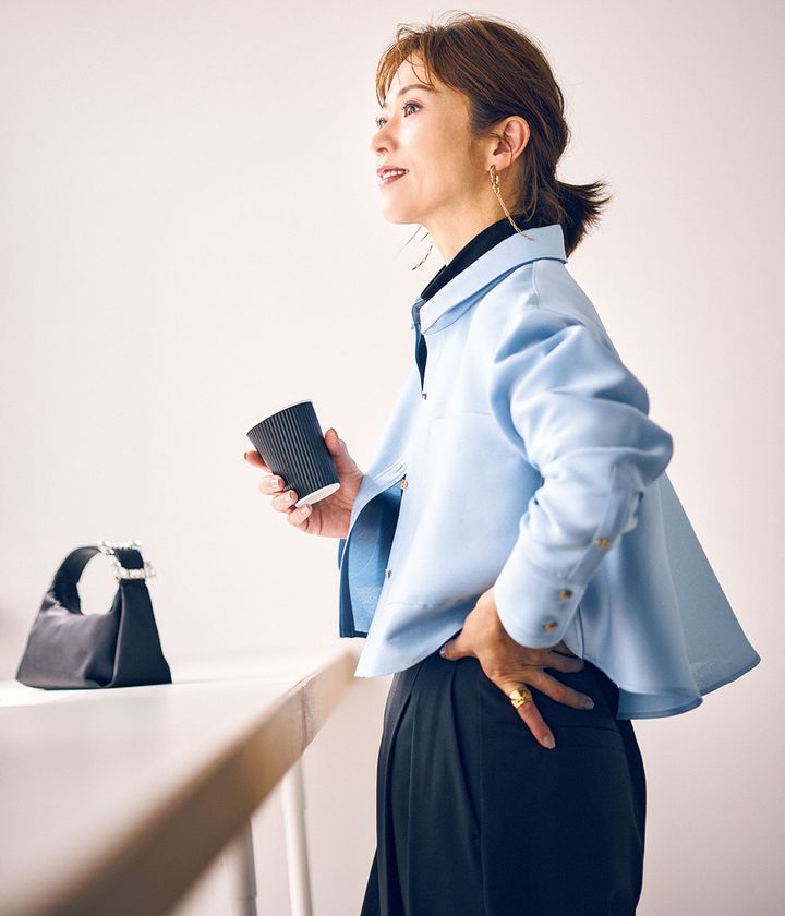 スカート¥66,000(ヒューエルミュージアム/ヒューエルミュージアム ギンザシックス)ジャケット¥35,200(メゾンスペシャル/メゾンスペシャル 青山店)肩に掛けたトップス¥41,800(ルームエイト ブラック/オットデザイン)バッグ¥148,500(ザンケッティ/八木通商)靴¥29,700(ダイアナ/ダイアナ 銀座本店)メガネ¥42,900(アイヴァン/アイヴァン 東京ギャラリー)ピアス¥39,600(ブランイリス/ブランイリス トーキョー)