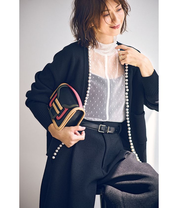トップス¥24,200(ルームエイト ブラック/オットデザイン)カーディガン¥66,000(ヒューエルミュージアム/ヒューエルミュージアム ギンザシックス)パンツ¥38,500(ソブ/フィルム)バッグ¥152,900(ピエール アルディ/ピエール アルディ 東京)ベルト¥24,200(MAISON BOINET/マルティニーク ルミネ横浜)ピアス¥62,700リング¥35,200(ともにヌゥ ユゥ/アイネックス)インナー(スタイリスト私物)