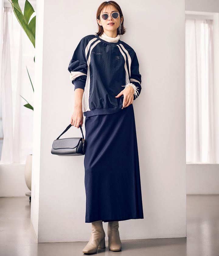 スウェットがドレッシーな装いを今っぽく和らげます。