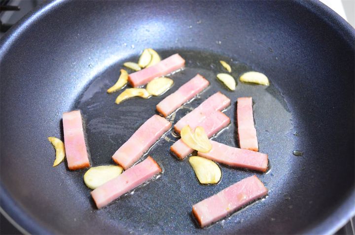 2フライパンにオリーブオイルを入れて、にんにくを焦がさないように炒めたら、ベーコンを加えて炒める。