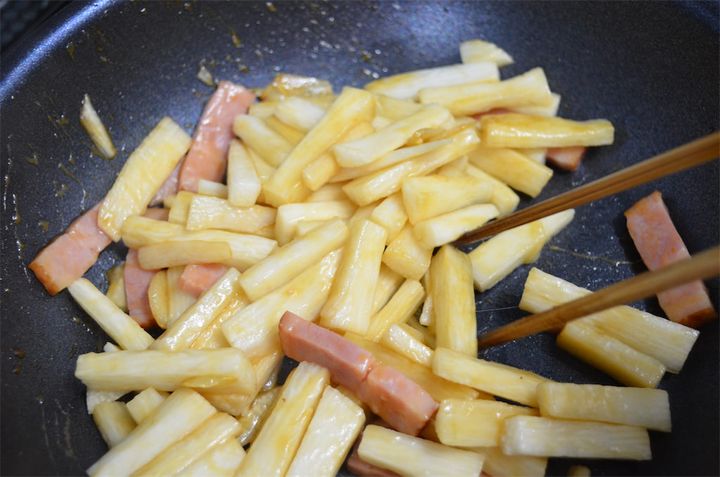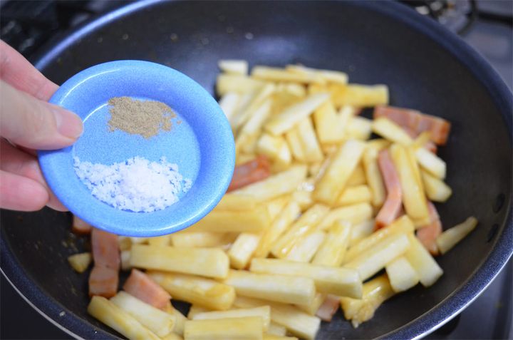 3.2に長芋を入れて炒めたら、しょうゆを回し入れて、塩、こしょうで味を調える。
