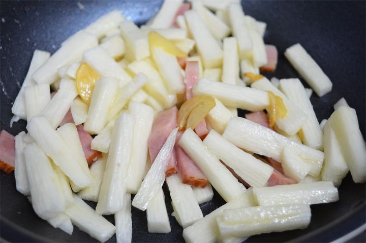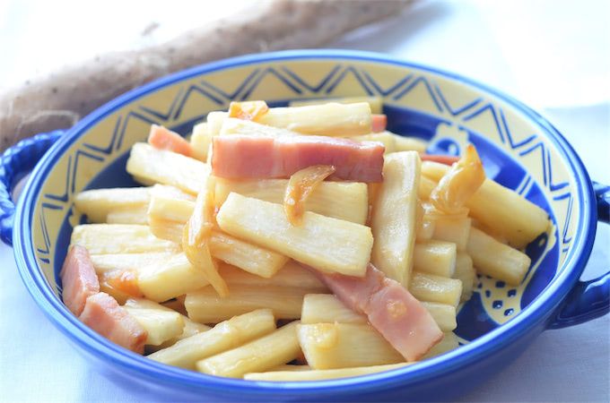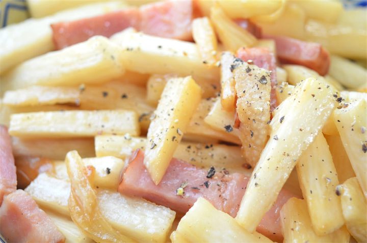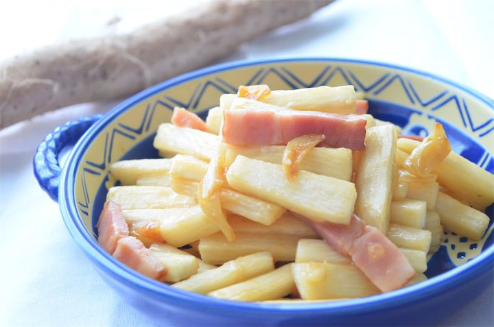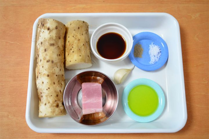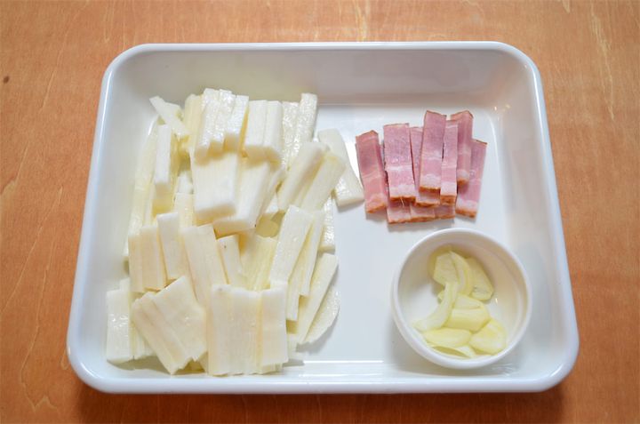 1.長芋とベーコンは拍子木切りにして、にんにくは皮と芽を取って薄くスライスする。