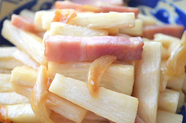 シャキシャキ食感の長芋とにんにくのパンチに負けず劣らずの存在感で、ベーコンの旨味が全体に行き渡っています。