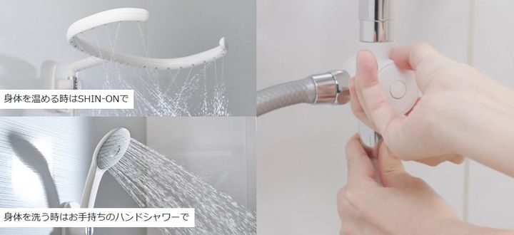 「SHIN-ON(シンオン)」はまるで湯船に浸かったかのように身体の芯まで温まるU字型シャワーヘッド。360度から出るシャワーやミストが身体中を包んで温め、身も心も癒される新感覚のシャワー浴です。