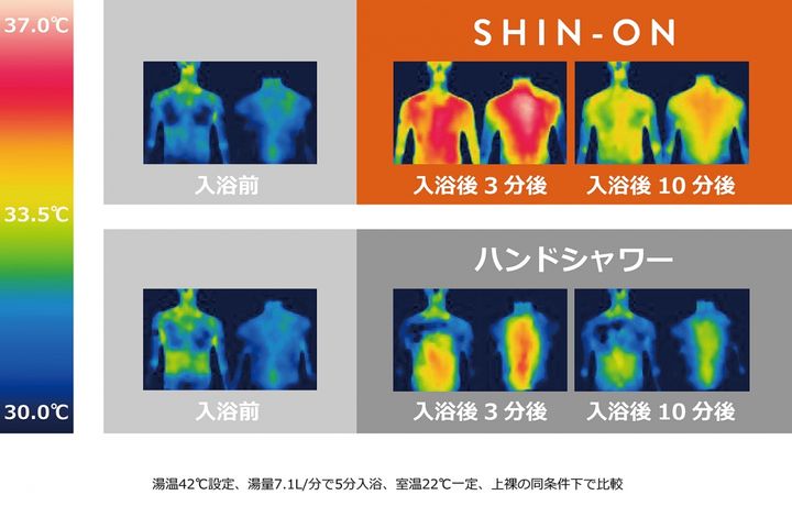 「SHIN-ON(シンオン)」は独自のU字型シャワーヘッドにより、なんと前後左右からの吐水が可能。身体の広範囲を一度に温めることができるので、通常のハンドシャワーのみを使用した時よりも上半身全体が温まり、浴びた後も温もりが持続します。