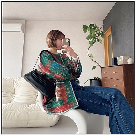 「バッグは、服とのバランスを第一優先に考えて選んでいます。メリハリのついたスタイリングが好きなので、手持ちのバッグはミニかBIGか、黒か白かの両極端。OSOIのバッグはスクエアなのに愛嬌のあるシルエットと、収まりのよさが気に入りすぎて、1年のうち300日はこれを持ってます」(伊集院さん)