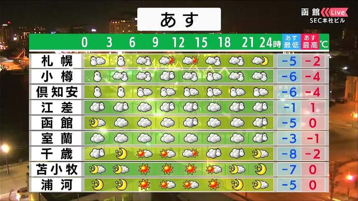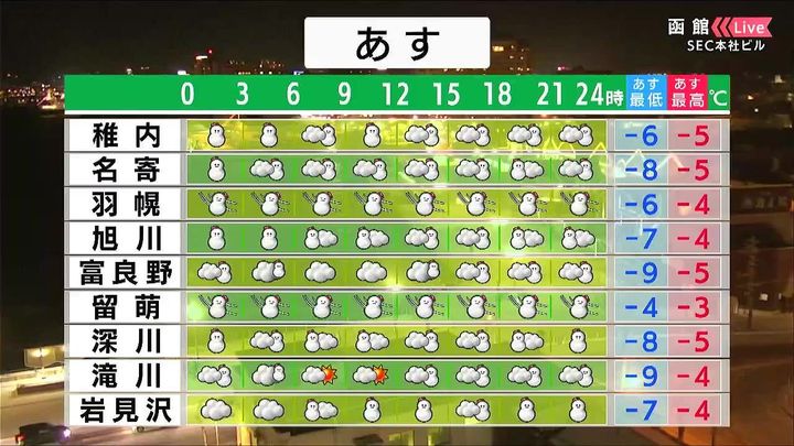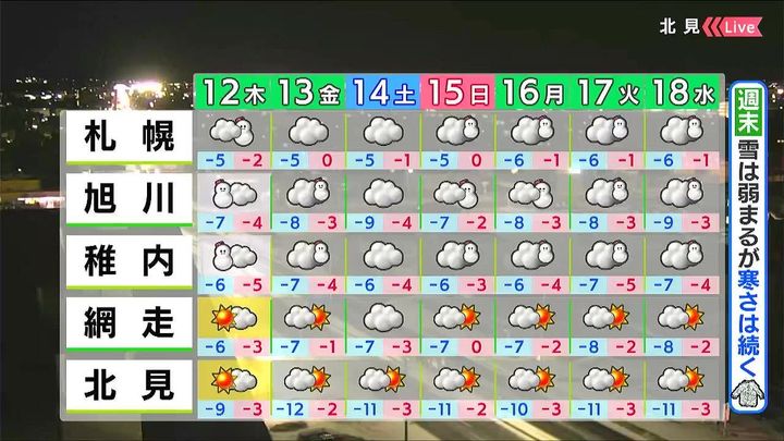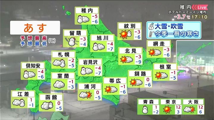 では、あす12日(木)の天気と気温です。日本海側を中心に大雪や吹雪に注意が必要です。全道的に今シーズン一番の寒さとなり、最高気温は札幌で‐2度、稚内は最高気温が‐5度にとどまります。