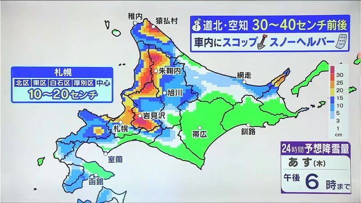猿払村など宗谷の一部、幌加内町朱鞠内など上川北部や留萌の山沿い、深川など北空知、岩見沢など南空知で30センチ前後です。知床周辺や倶知安、札幌周辺でも20センチ前後です。札幌は中心部より北の地域で20センチのまとまった雪になりそうです。吹きだまりにタイヤがはまるおそれもあるので、車にスコップなどを積んでおきましょう。