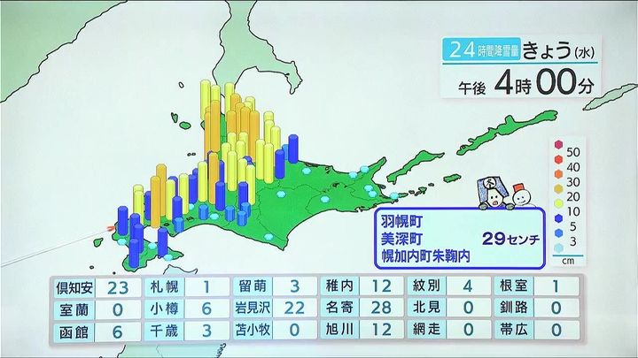 こちらは、きょう午後4時までの24時間に降った雪の量です。