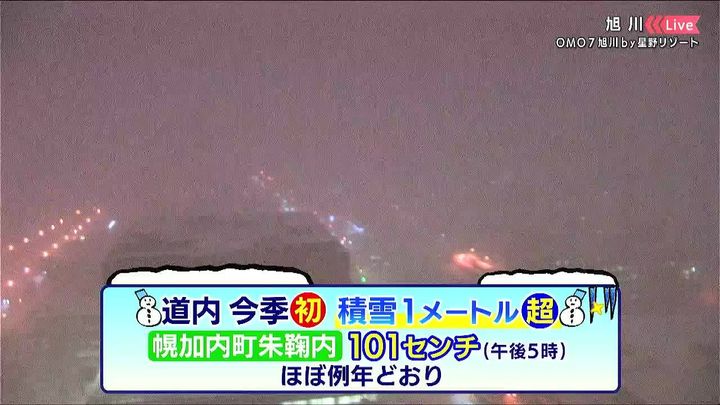 画面は、きょう11日(水)午後5時20分頃の旭川のようすです。旭川の積雪は29センチですが、同じ上川地方の幌加内町朱鞠内では、積雪が101センチになり、道内でこの冬初めて積雪が1メートルを超えました。