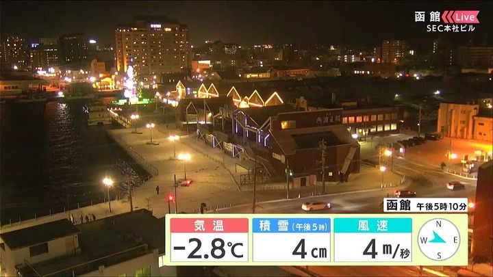 こちらは、きょう午後5時20分頃の函館です。ツリーがキレイですが、路面はうっすら白いですね。