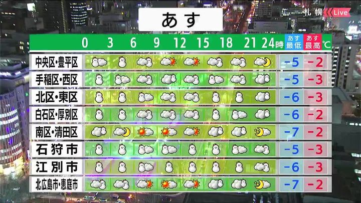北区や東区、白石区、厚別区、石狩、江別は断続的に雪が降り、交通障害に注意して下さい。中央区や豊平区、手稲、西区、厚別区、北広島方面でも朝晩を中心に10センチ前後の雪が降るでしょう。
