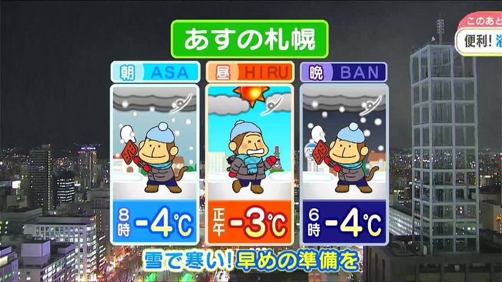 あすの札幌の朝昼晩の天気をもんすけでお伝えします!