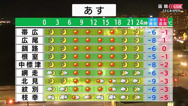 道東・オホーツク海側です。晴れても風が冷たいでしょう。枝幸は雪が降りやすくなりそうです。朝の冷え込みも強く、北見は‐9度、十勝の陸別町は‐15度を下回るでしょう。