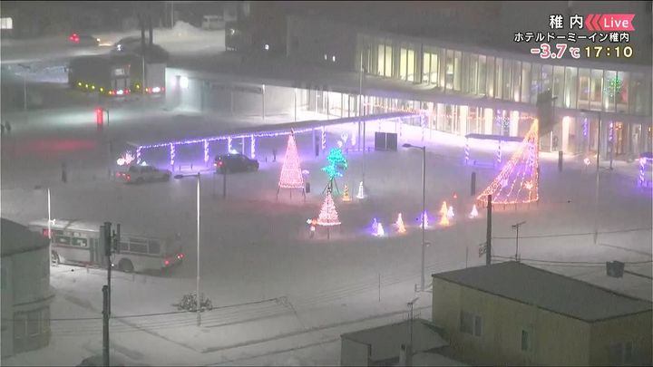 画面はいまの稚内です。きのうから、駅前のイルミネーションが始まりました。来年2月下旬まで楽しめるそうです。華やかですが、あすは稚内でも雪や風が強まって、冬の防寒対策も必要になります。