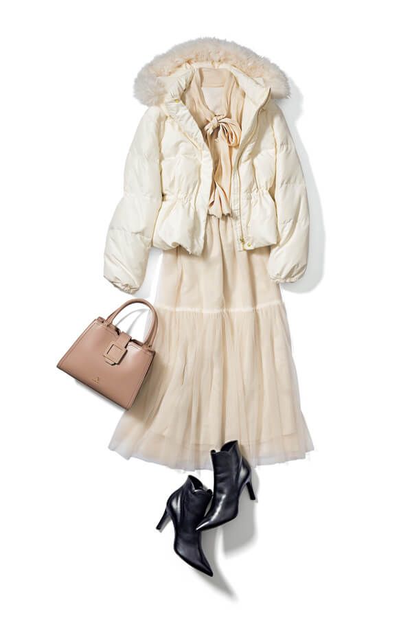 保温性抜群のダウンは、ファー付きフードも装着して完全なる冬仕様に。ブラウスとスカートも色みをそろえたワントーンが優しげ。