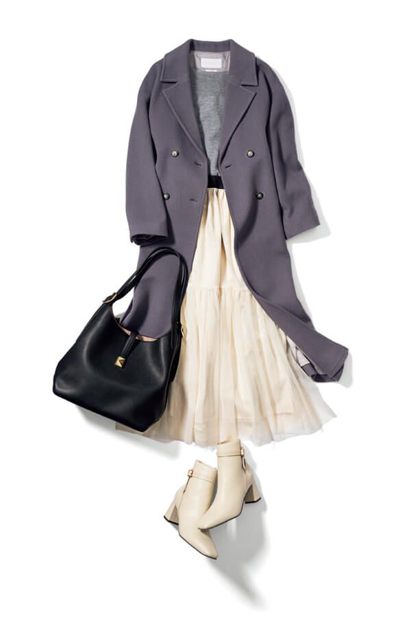 丈が足元近くまであるロングコートをはおれば、暖かいのはもちろん、チュールスカートが北風になびくストレスもなくて安心。