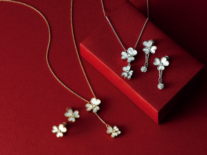 白蝶貝で作られたハート型の花びらを組み合わせ、アイコンモチーフを表現。ホワイトのピュアな輝きがレディなコーデと好相性♡