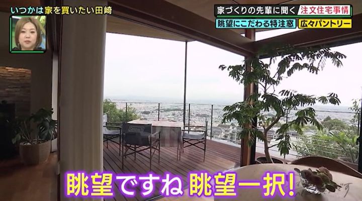 というのも、およそ23帖のLDKは特注の一枚窓を設えられ、見晴らしの良い絶景が広がり、スカイテラスからは街を一望。夏には猪名川花火大会を目の前で楽しめるのも自慢のひとつだという。「眺望一択で選んだ」というご主人の眺めにこだわった注文住宅に田崎は感激。だが、驚きはそれだけではなかった。充実の収納スペースやコストカットのポイントなど、注文住宅ならではのアイデアを教えてもらう。
