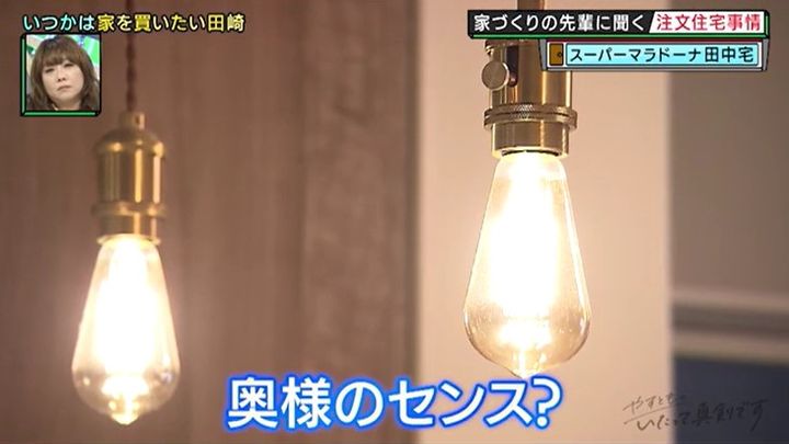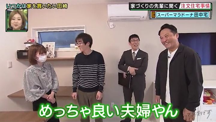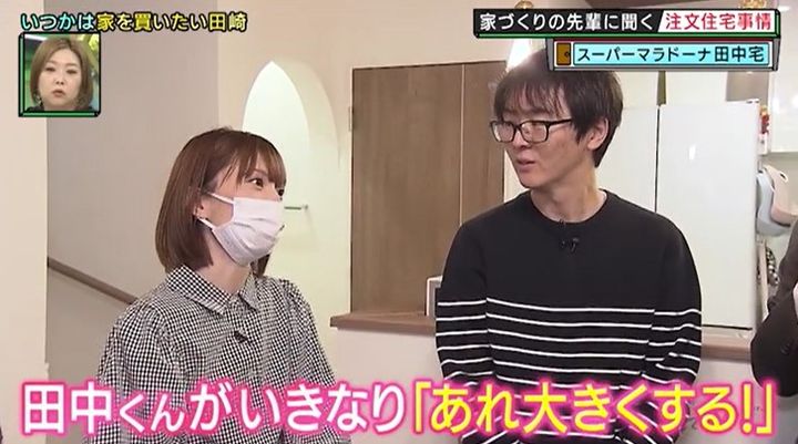 1軒目に訪ねたのは、元M-1ファイナリスト、スーパーマラドーナ・田中が家族と暮らす築1年の一軒家。奥さん主導の注文住宅ということで奥さんも出演し、案内してくれる。3階建ての2階は約18帖のLDK。明るくオシャレにまとめられた奥さんのセンスに田崎も「幸せなLDK」と絶賛。