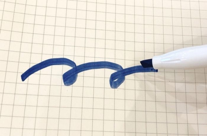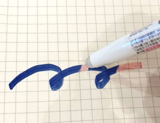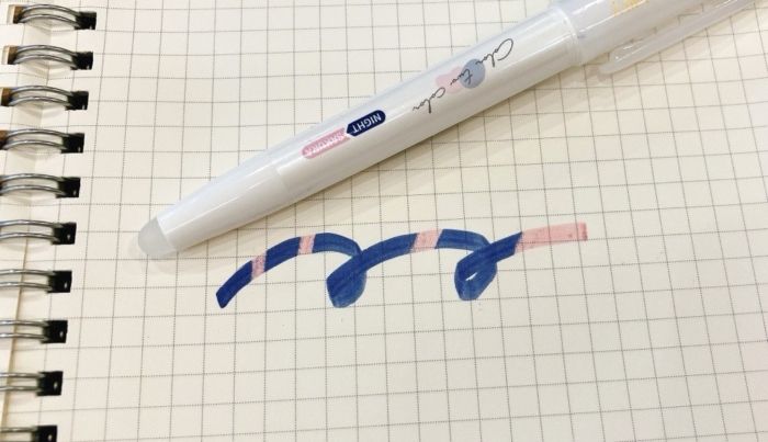 私が購入したのは、マーカーの新色で「ナイト-サクラ」色と「セピア-ネモフィラ」色です。 まずは「ナイト-サクラ」色。ナイト色でマーカーします。 マーカーで塗ったところを、ペンの後ろの専用ラバーでこするとサクラ色に! 簡単にバイカラーができちゃいます。