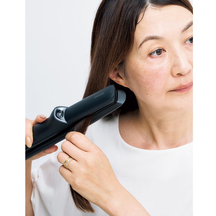 高浸透ナノイーとミネラルを初めて搭載。髪1本1本の深層まで潤いで満たします。摩擦ダメージを抑え、枝毛や切れ毛の発生を低減。ストレートアイロン ナノケア ¥34,650(税込)〈編集部調べ〉(パナソニック)