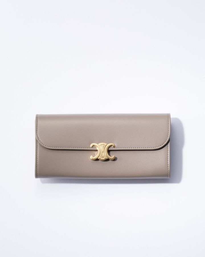 「指名買いが絶えないセリーヌの財布。煌めくトリオンフのメタルクロージャーに、美しいナチュラルトーンが好印象の長財布。『それ、買ったの?』と気づいてくれるアイコニックな逸品は、バッグから手に取るたびに満足感にひたれます。」