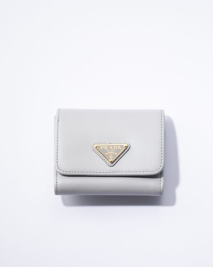 「毎日目にする革小物は、人気のラグジュアリーブランドから選びたい!上品な艶があり、トライアングルロゴが調和するエレガントな三つ折り財布。柔らかな女性へと誘う優しいグレーが新鮮。ミニバッグにもスマートに収まります。」