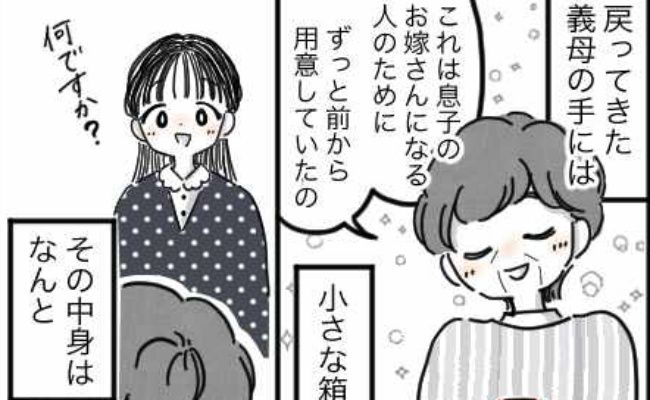 突然、立ち上がって「そうだ、大事なものを渡さなきゃ」と別の部屋へ何かを取りに行った義母。そして部屋に戻ってきた義母の手には、小さなアクセサリー箱のようなものが。それを私に差し出し「これは息子くんのお嫁さんになる人にずっと前から用意していたの。遠慮なく受け取ってね!」と言うのです。