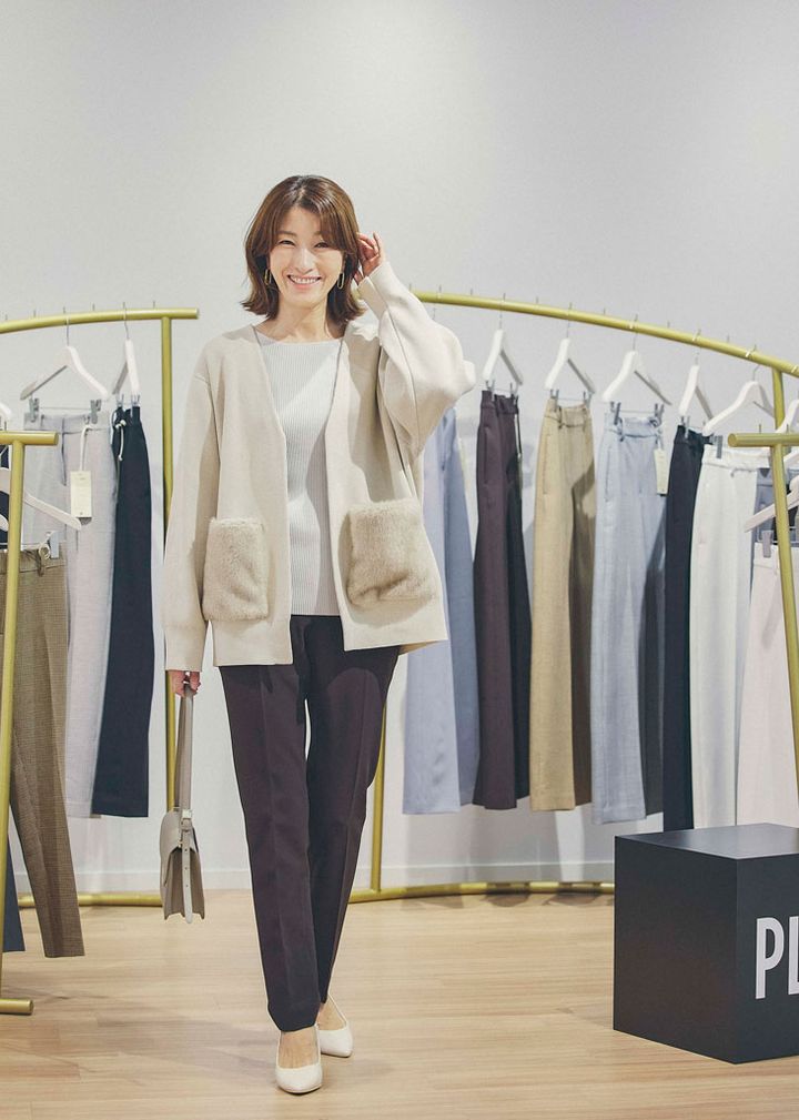PLUS STYLEスティックパンツ(ウォームリザーブ)¥9,990※Mサイズ着用 フェイクファーポケットカーディガン¥13,000※Lサイズ着用 パールビーズリブニットプルオーバー¥7,990[12 月中旬販売予定]パンプス¥11,000 コンパクトショルダーバッグ¥12,000(すべてプラステ)