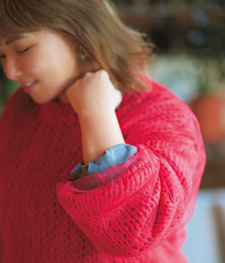 チュールプルオーバー¥9,900(アダム エ ロペ)中に着たニット¥5,990(ザラ/ザラ カスタマーサービス)パンツ¥25,300(コンテ/conte 青山店)バッグ¥113,300(フルラ/フルラ ジャパン)ピアス¥7,800(ミーナジェムス/ロードス)バングル¥25,300リング¥12,100(ともにワンエーアールバイウノアエレ/ウノアエレ ジャパン)