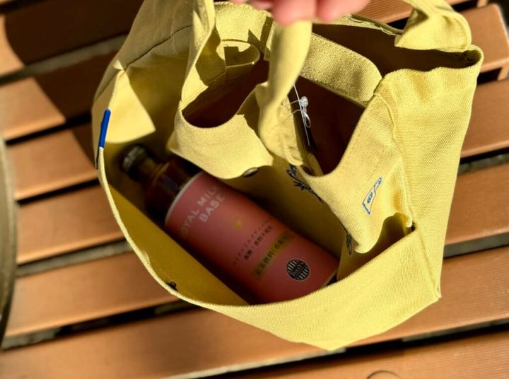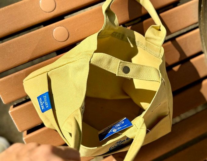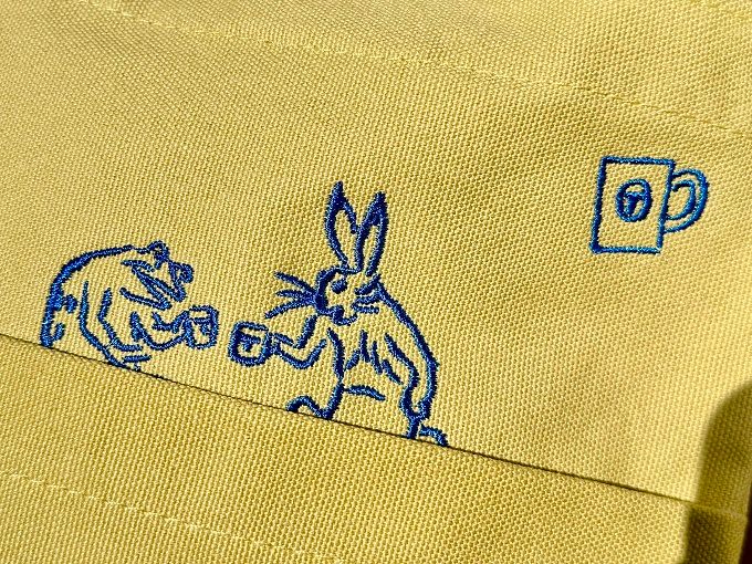 外側に大きなポケット、内側に小さなポケットが付いた、小さいのに容量たっぷりの手持ちトートバッグ。若菜色のカラーに、青い刺繍がよく映えています。刺繍のイラストは、タリーズとのコラボアイテムのために特別に描きおろされたもの。マグをもって乾杯するうさぎとカエルがマニアの心をくすぐりますね。