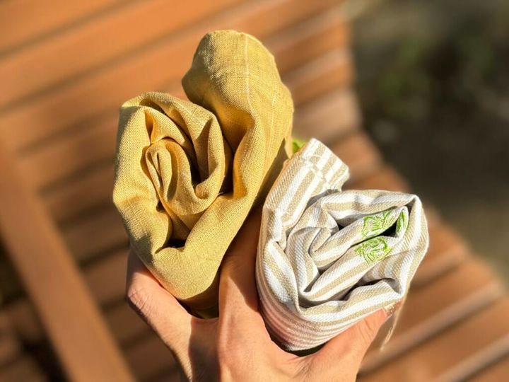 描き下ろしイラストが大きく総柄で描かれたオリジナルの手ぬぐい。これまた絶妙なカラーリングが可愛い! ピンクとマスタードから好きな方を選んで注文できますよ。
