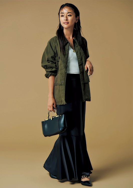 エレガントなサテンスカートは、×ミリジャケでギャップを強めるのが新鮮。インナーはカシミアで、リュクスな雰囲気をもうワンプッシュ。