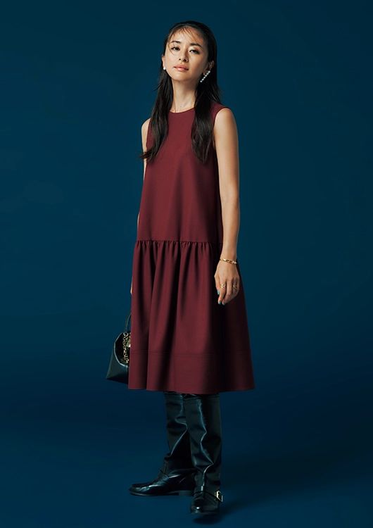 ワンピース¥74,800/FOXEY(FOXEY 銀座本店)ピアス¥39,600、バングル¥49,500、リング[薬指]¥220,000/以上カラットアー(イセタンサローネ東京) リング[人さし指]¥53,900/アナプノエ(フォーティーンショールーム) バッグ¥181,500/ザンケッティ(八木通商) ロングブーツ¥132,000/ネブローニ