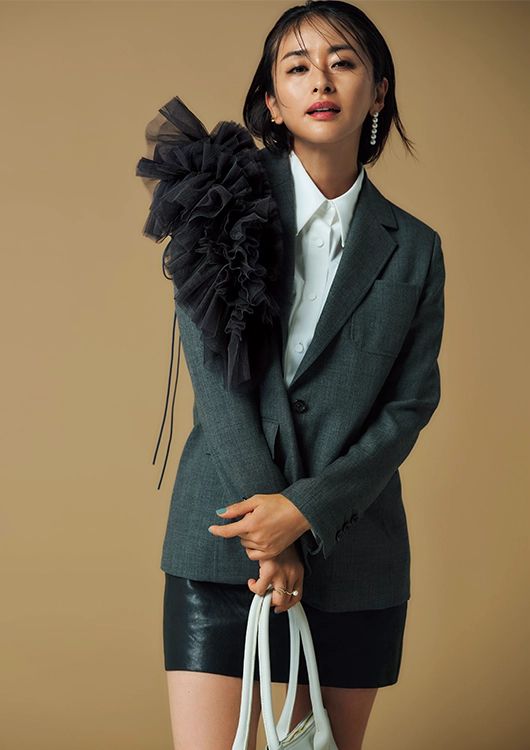 ジャケット¥68,200、シャツ¥28,600/ともにエストネーション、 スカート¥126,500/リトコフスカ、チュールベルト¥ 38,500/マージ(以上エストネーション) ピアス¥39, 600、イヤカフ¥99,000、リング¥187,000/以上カラットアー(イセタンサローネ東京)) バッグ¥53,900//レ ミネ(ティースクエア)