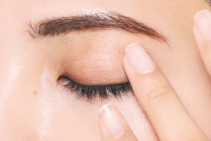 Aの赤みのあるパールブラウンのアイシャドウを指にとり、アイホールの中央にのせたあと、ワイパーのように左右に広げて奥行きを。