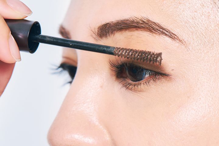 ビューラーでカールアップさせたまつ毛にBのブラウンのマスカラを。根元よりも中間〜毛先にしっかりと塗り長さを出すのがコツ。