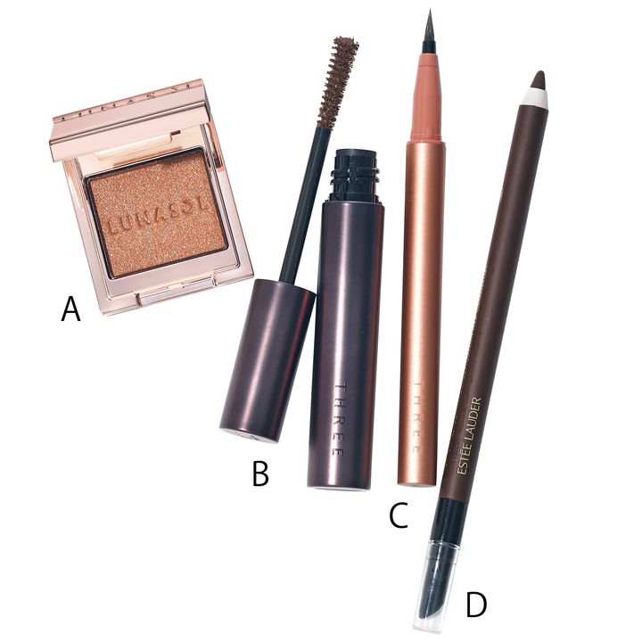 Aシアーな発色と絶妙なシャイニー感で単色でもしっかりと立体感を生み出す。指塗りでラフに広げて。ルナソル モノアイカラーレーション 06 ¥3,520(カネボウ化粧品) Bロング、ボリューム、カールキープ、セパレートのすべてをかなえる。ワイズアイズパースペクティヴ マスカラ 05 ¥4,400(THREE) C引き締め効果と抜け感の両方が手に入るメタリックグレージュ。エフォートレスな印象に。ファントゥファンキー リキッドアイライナー X05 ¥3,300※10/30数量限定発売(THREE) D深みのあるココア色。なめらかな描き心地が魅力。ウォータープルーフ処方でインラインでもにじまない。ダブル ウェア ウォータープルーフ ジェル アイ ペンシル 03 ¥4,950(エスティ ローダー)