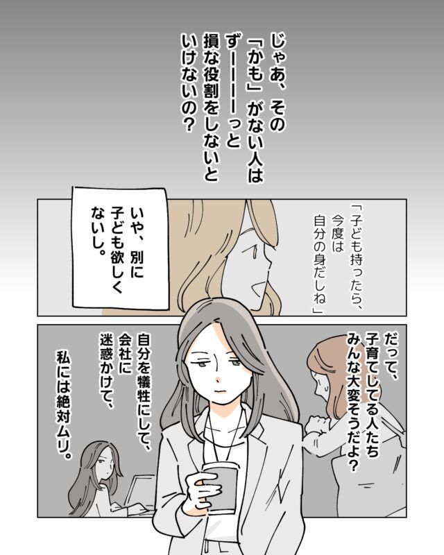 「いつかは子どもを産む『かも』」「親の介護で休む『かも』」、同僚たちの言葉を聞いた亜美さんは、「じゃあ、その『かも』がない人は、ずーーーーーっと損な役割をしないといけないの?」とモヤモヤ。「子どももったら、今度は自分の身だしね」という声にも「いや、別に子ども欲しくないし」と心の中で即答した上で、「だって、子育てしてる人たち、みんな大変そうだよ?自分を犠牲にして、会社に迷惑かけて・・私には絶対ムリ」と呟きました。