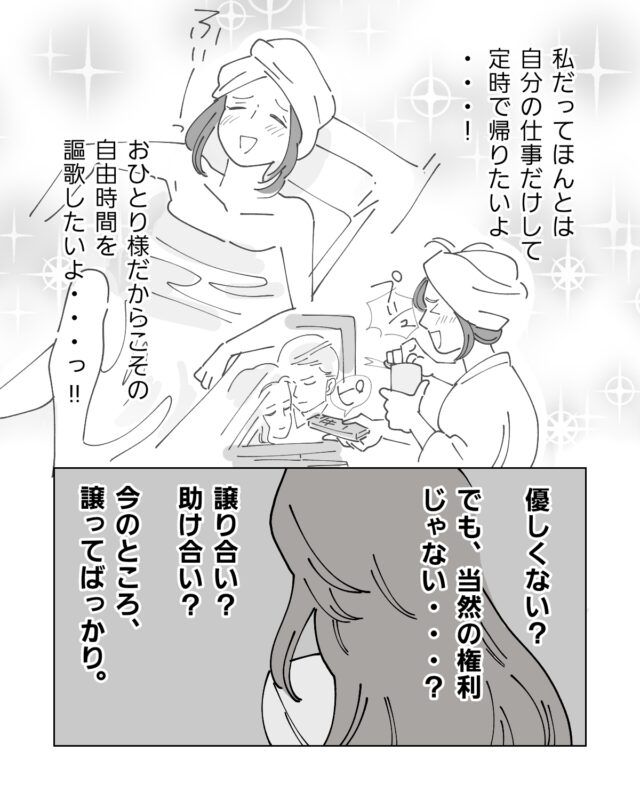 そして、「私だってほんとは自分の仕事だけして定時で帰りたいよ・・!おひとり様だからこその自由時間を謳歌したいよ・・っ!!優しくない?でも、当然の権利じゃない・・?譲り合い?助け合い?今のところ譲ってばっかり」