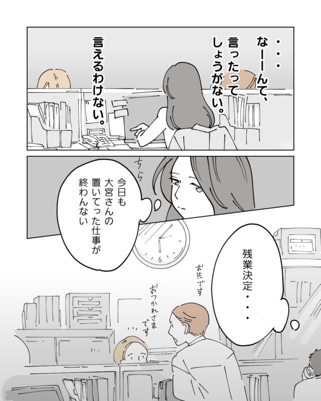 「・・なーんて言ったってしょうがない。言えるわけない」心の中で事故完結した後、「今日も大宮さんの置いてった仕事が終わんない。残業決定・・」定時になり、周りの人たちはチラホラと帰り出すなか、さまざまな思いをグッと飲み込んで亜美さんは呟きました。