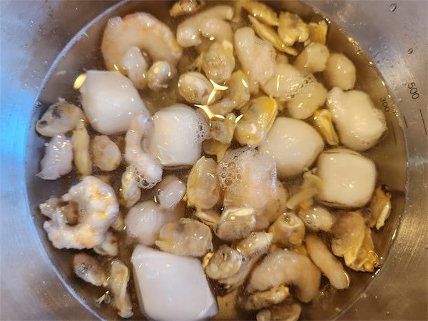 4. 3に水と鶏がらスープの素、塩、こしょうを入れ、煮立ったら1のシーフードミックスを入れて2~3分煮込みます。
