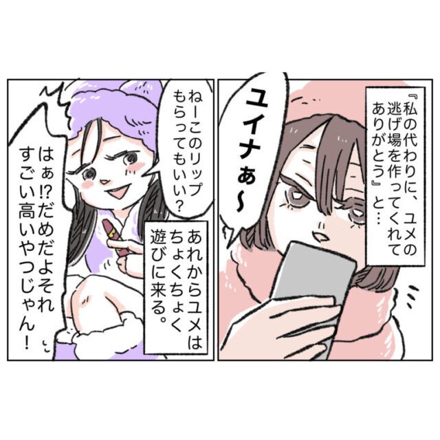 『私の代わりにユメの逃げ場を作ってくれてありがとう』それがお姉ちゃんからのメッセージ。その時、うしろからユメの声がした。「ユイナぁ~、ねぇこのリップもらってもいい?」私のコスメポーチの中からリップを取り出してる。あれからユメはちょくちょく家に遊びに来るようになった。大好きな絵を描くことを続けながら、学校や塾の勉強も頑張っているみたい。「「はあ!?ダメだよ。それすごい高いやつじゃん!」私たちはもうすっかり仲良し。
