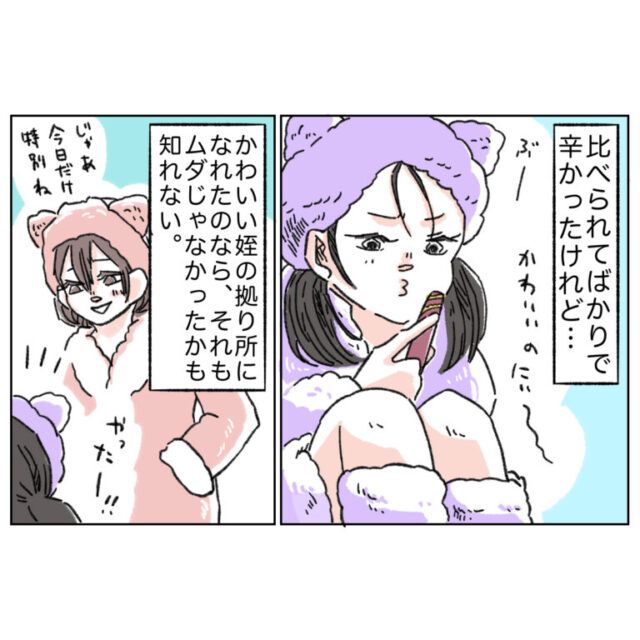 「ぶー!かわいかったのにぃ~」と文句を言いながらリップを握りしめているユメを見ていると「じゃあ今日だけ特別ね!」やっぱりかわいくて甘くなってしまう。「やったー!!」大喜びするユメの姿に私も笑顔になる。「これまで比べられてばかりで辛かったけど・・かわいい姪の拠り所になれたのなら、それもムダじゃなかったかもしれない」辛かった思い出を振り返りそんな風に思っていた。