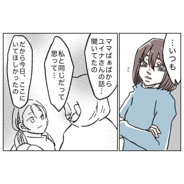 実家を出て家族との連絡を絶っていたものの、姉サナさんの長女ユメちゃんからの電話で数年ぶりに帰省したユイナさん、自慢ばかりするユメちゃんの弟ソウマくんをベタ褒めするお母さんと、何を言われても黙っているユメちゃんを見て、ユメちゃんに呼ばれた理由を理解したユイナさんはユメちゃんがかわいそうと言いました。その言葉を理解できないサナさんを責めつつ、「私みたいになったらどうするの?」と問い詰めると、「・・もうなってるよ。ユメはパパとママのほんとの子どもじゃないんじゃないかって」と大粒の涙をぽろぽろこぼしながらユメちゃんが言いました。