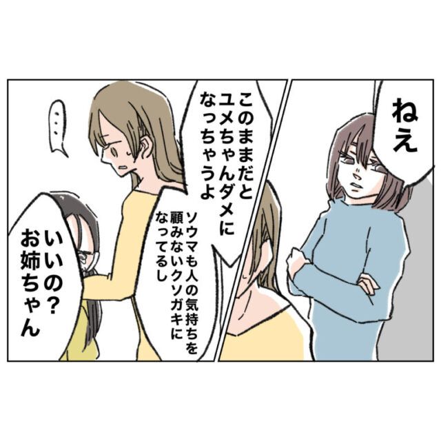 「ねえ、このままだとユメちゃんダメになっちゃうよ。ソウマも人の気持ちを顧みないクソガキになってるし」「・・・」無言になったお姉ちゃんに、「いいの?お姉ちゃん」ダメ押しするように言った。