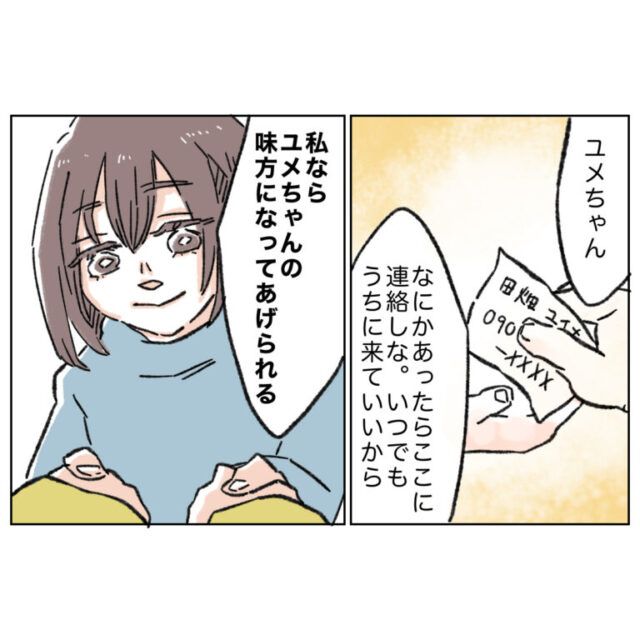 そして、「ユメちゃん、なにかあったらここに連絡しな。いつでもうちに来ていいから」スマホの番号を渡した。「私ならユメちゃんの味方になってあげられる」私はそう確信していた。