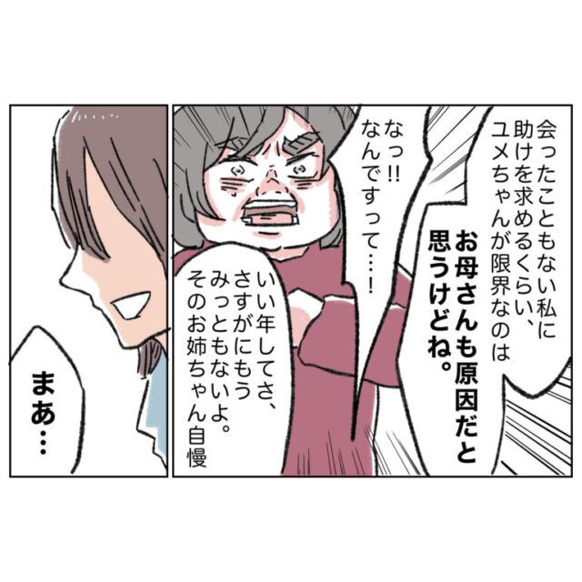そして、「会ったこともない私に助けを求めるくらい、ユメちゃんが限界なのはお母さんも原因だと思うけどね」そうお母さんに言うと、「なっ!!なんですって・・!」と驚いてムキになってきた。「いい歳してさ、さすがにもうみっともないよ。そのお姉ちゃん自慢」もう言葉が止まらなかった。